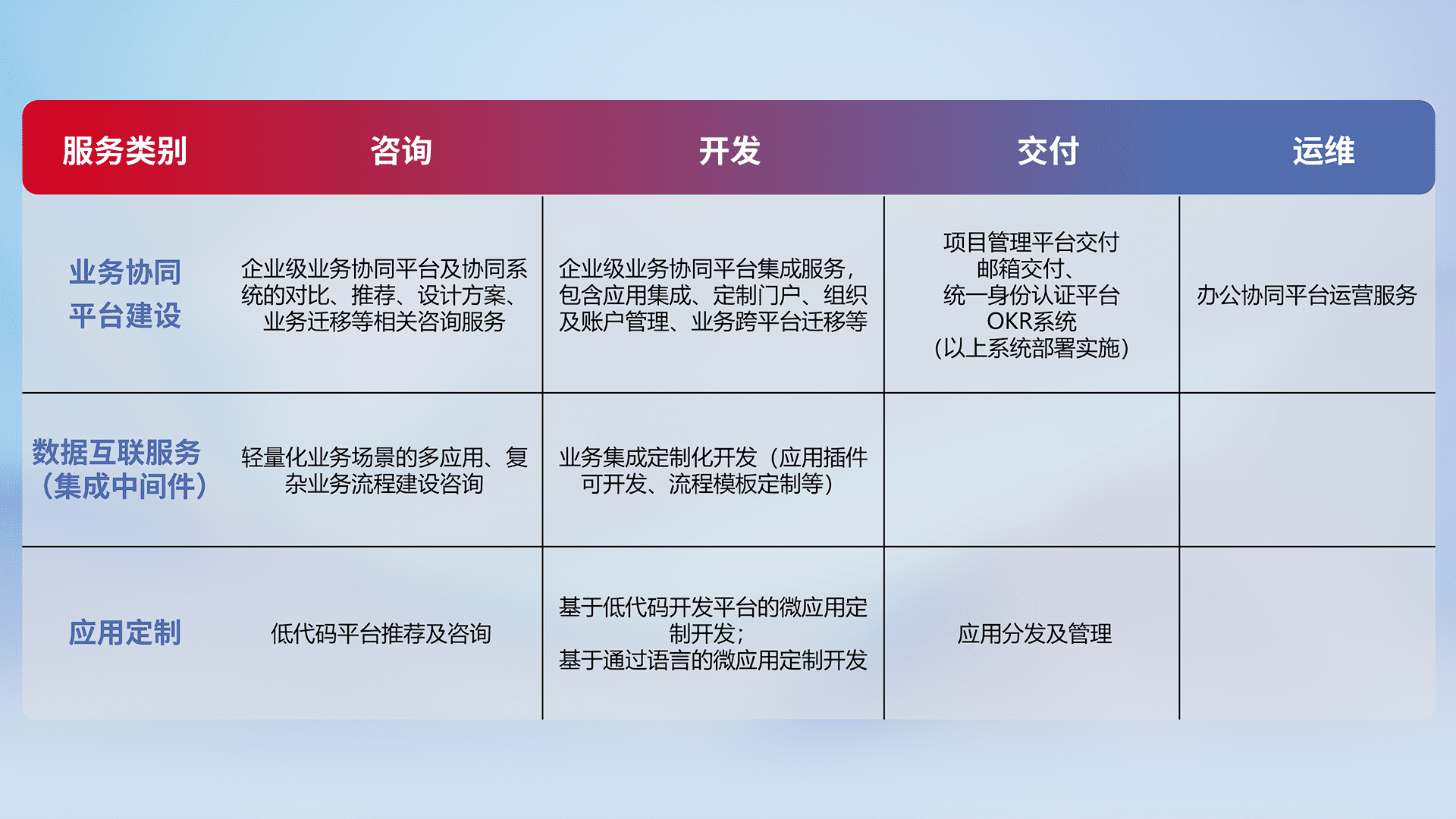 针对钉钉、、、企微、、IDaas等平台级产品提供产品的规划、、、、方案、、交付、、定制化开发等服务,,实现如统一协同办公、、智能客户服务、、、、混合会议管理、、智能数据查询、、、等业务场景,,,实现数字化转型。。。